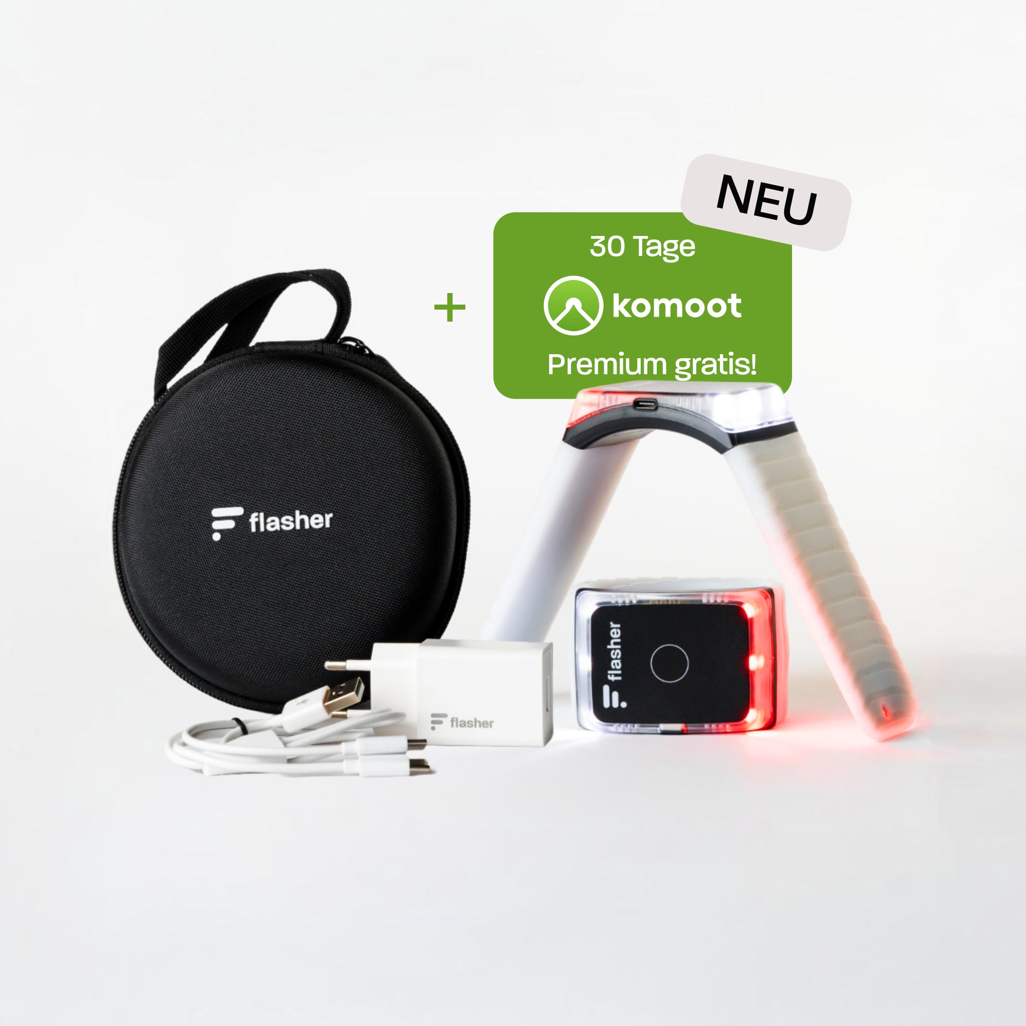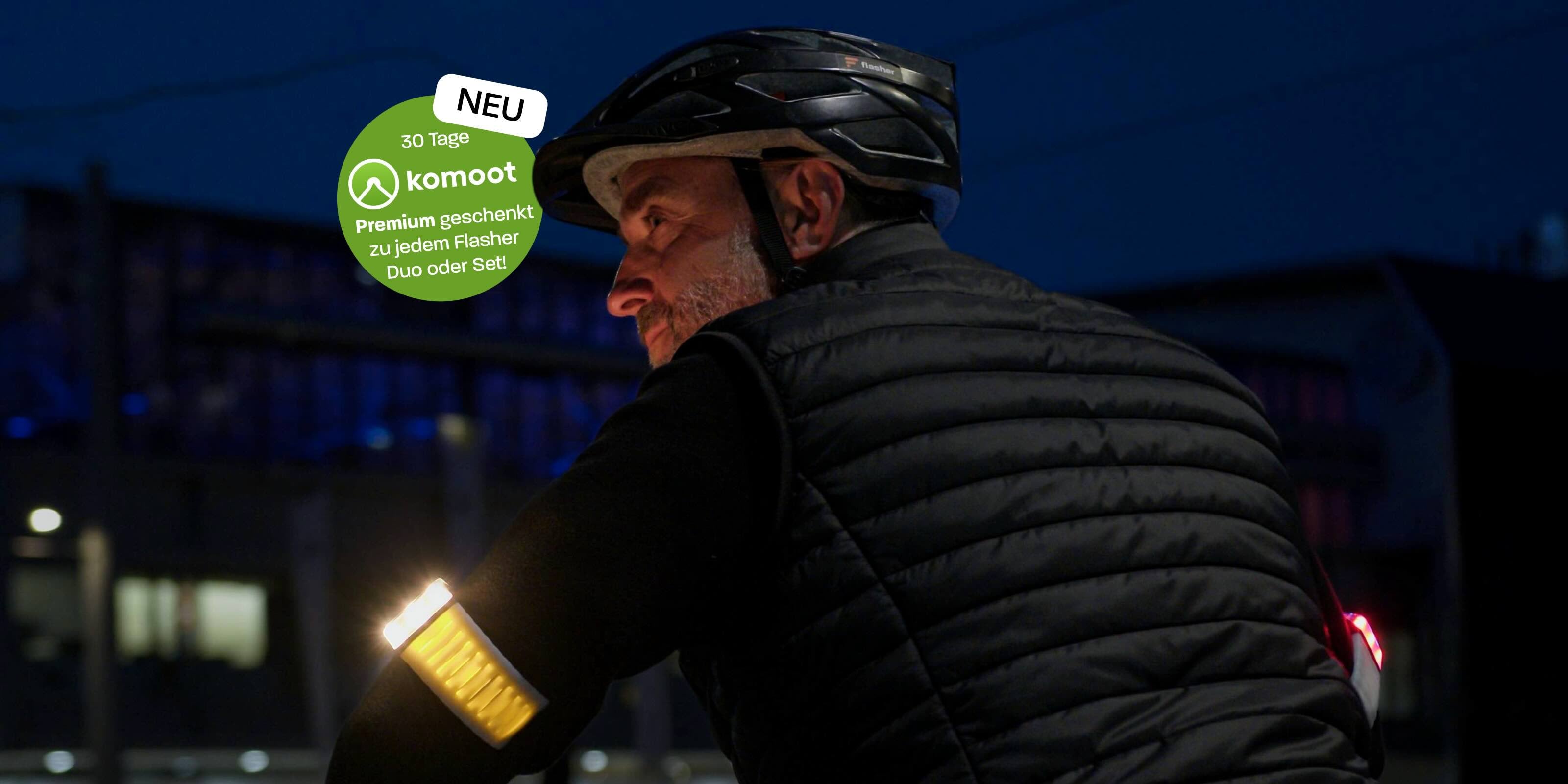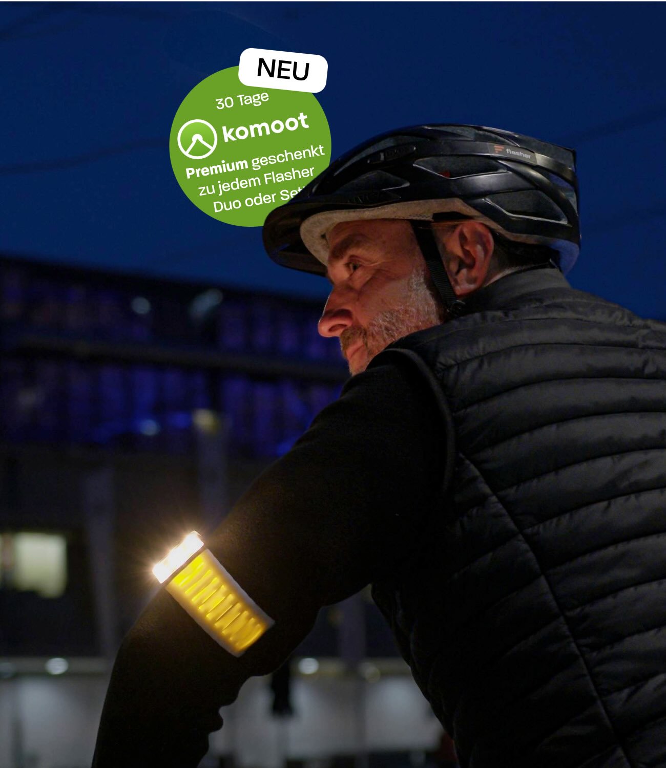 Flasher beleuchtet Dich genau dort, wo Du es brauchst: Hoch oben, weit außen, rundum und zu jeder Tageszeit. Damit Autos beim Überholen mehr Abstand zu Dir halten.
