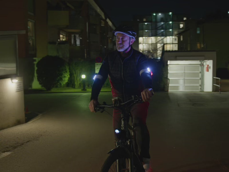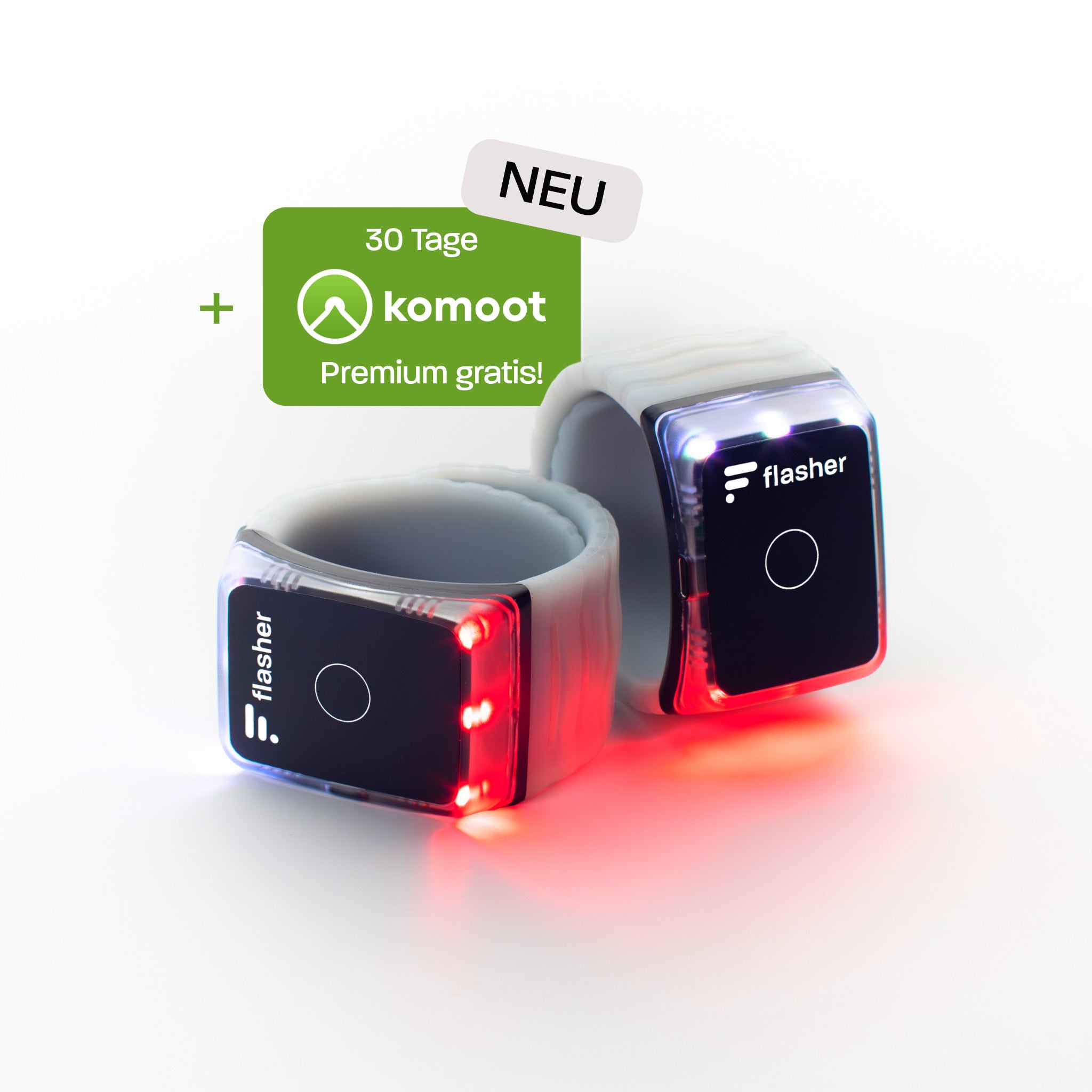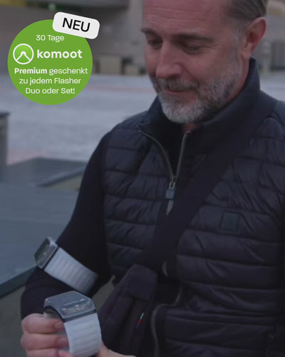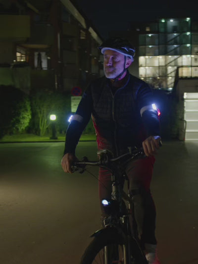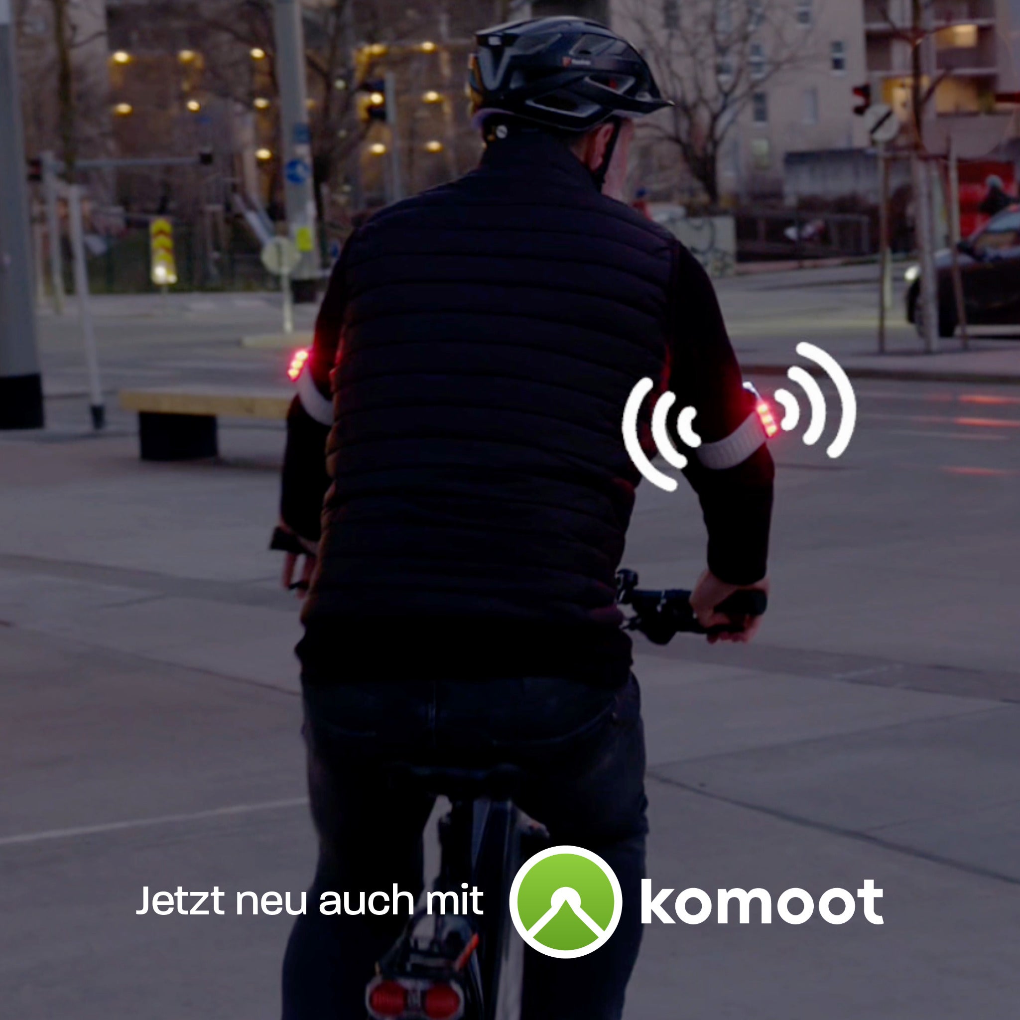 Die patentierten, StVO-konformen High-Tech-Armbänder für maximale Sicherheit am Fahrrad. Im Set mit Schutzhülle und Netzteil.