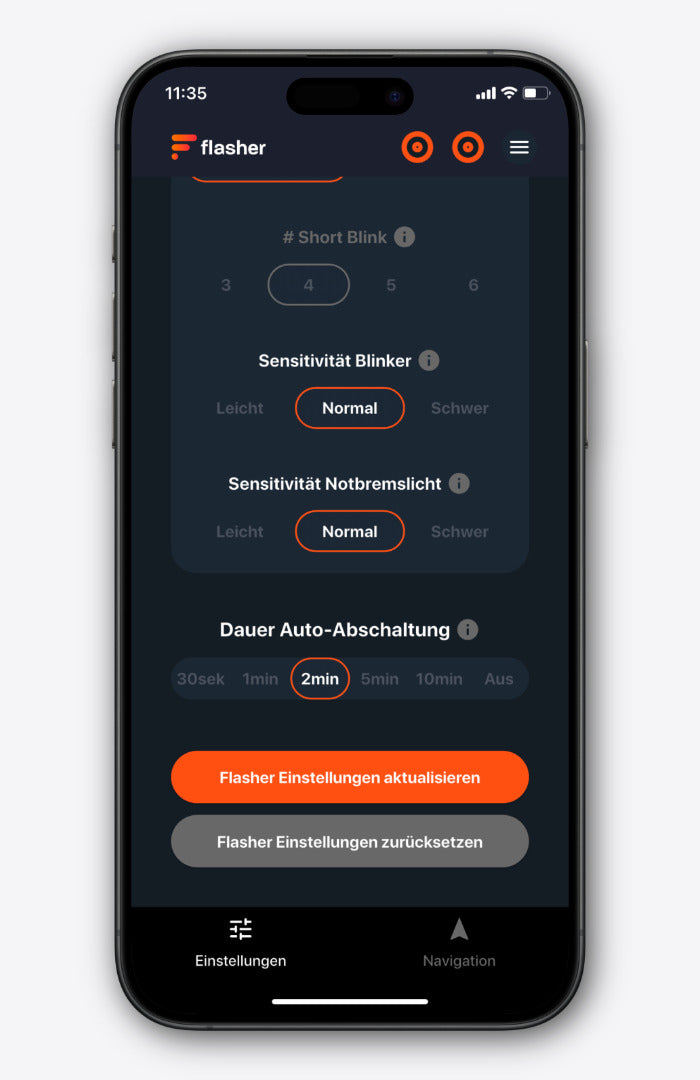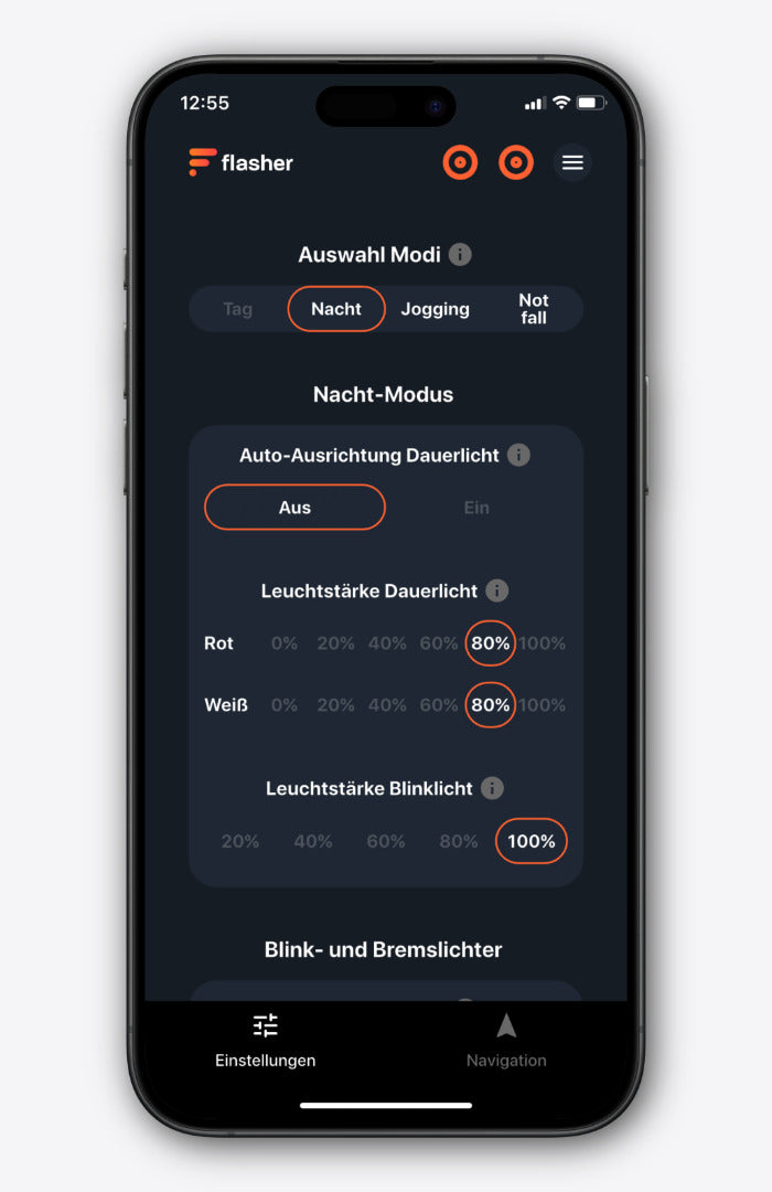 Brightness, sensitivity, automatic calibration — perfectly adapt your Flasher armbands to your riding style in with the free Flasher app. Available for iPhone and Android.