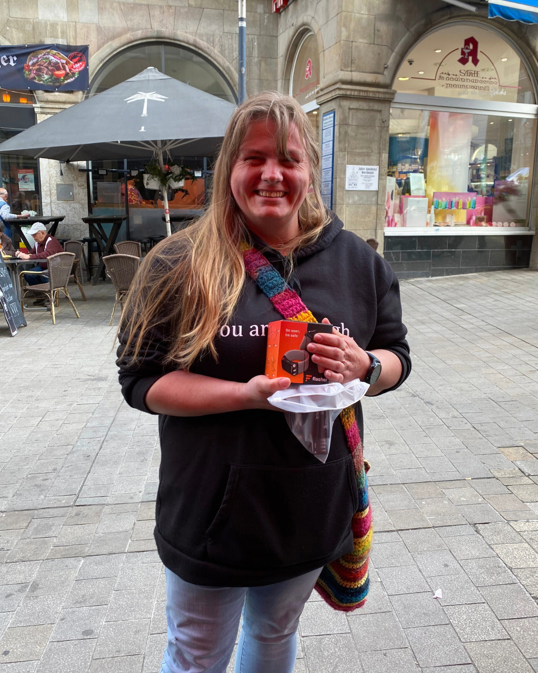 Die meisten kommen zum Stand, weil sie ein helles Licht sehen. Dann hören wir oft die Vermutung, dass Flasher wohl eine Art Beleuchtung beim Fahren sei. Wenn man dann erklärt und vorzeigt, dass es ein Blinker, ein Bremslicht und eine Beleuchtung am E-Bike, Scooter und zu Fuß ist, gehen bei den meisten Zuhörern die Augenbrauen erstaunt hoch. Spätestens beim Stichword “Navigation” kommt dann der Satz, der uns sehr freut: “Wow, das kann es auch?”. Relativ schnell kommen dann die Ideen, wo man Flasher überall einsetzen kann: klar, am Arbeitsweg, beim Einkaufen, abends und tagsüber, auf Radtouren, im Urlaub, und und und.